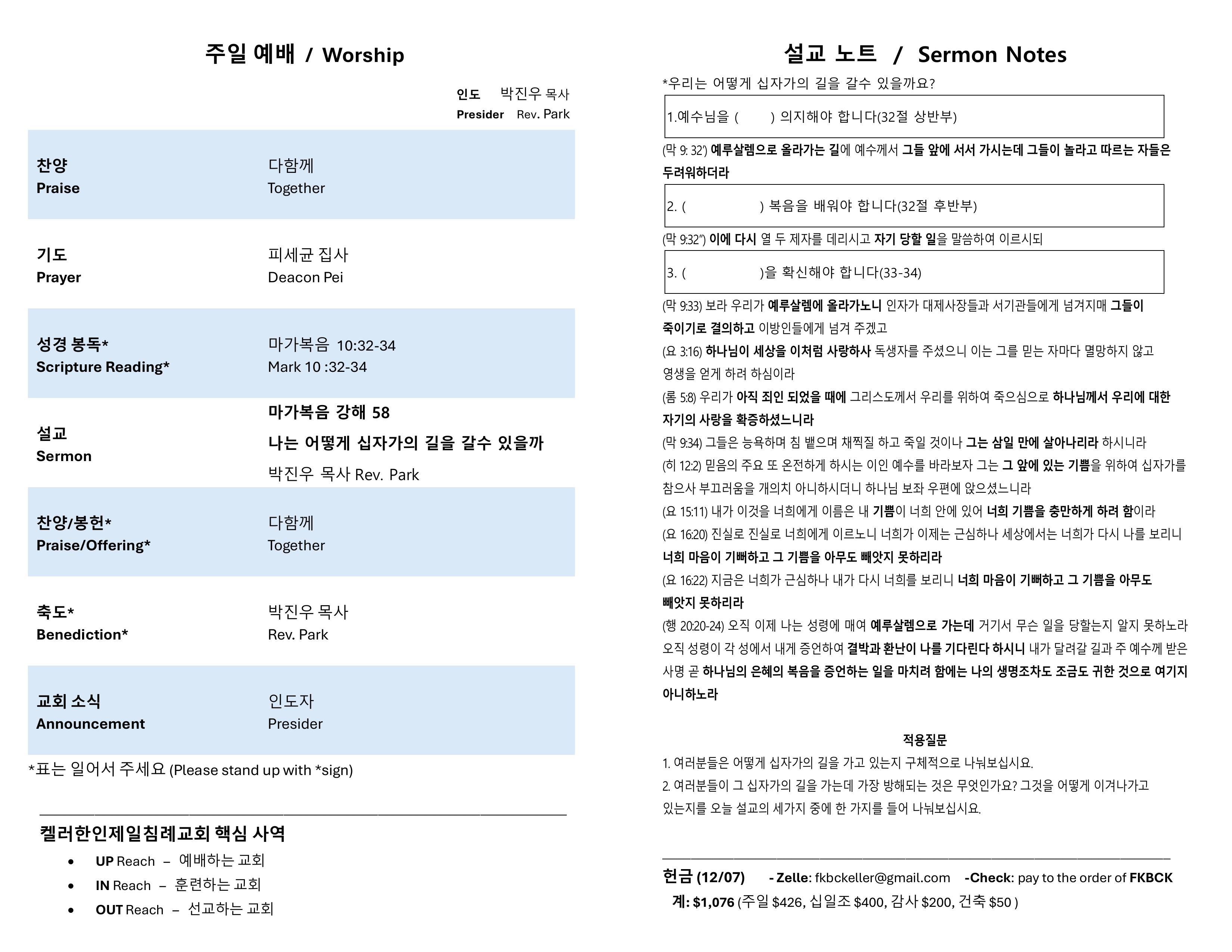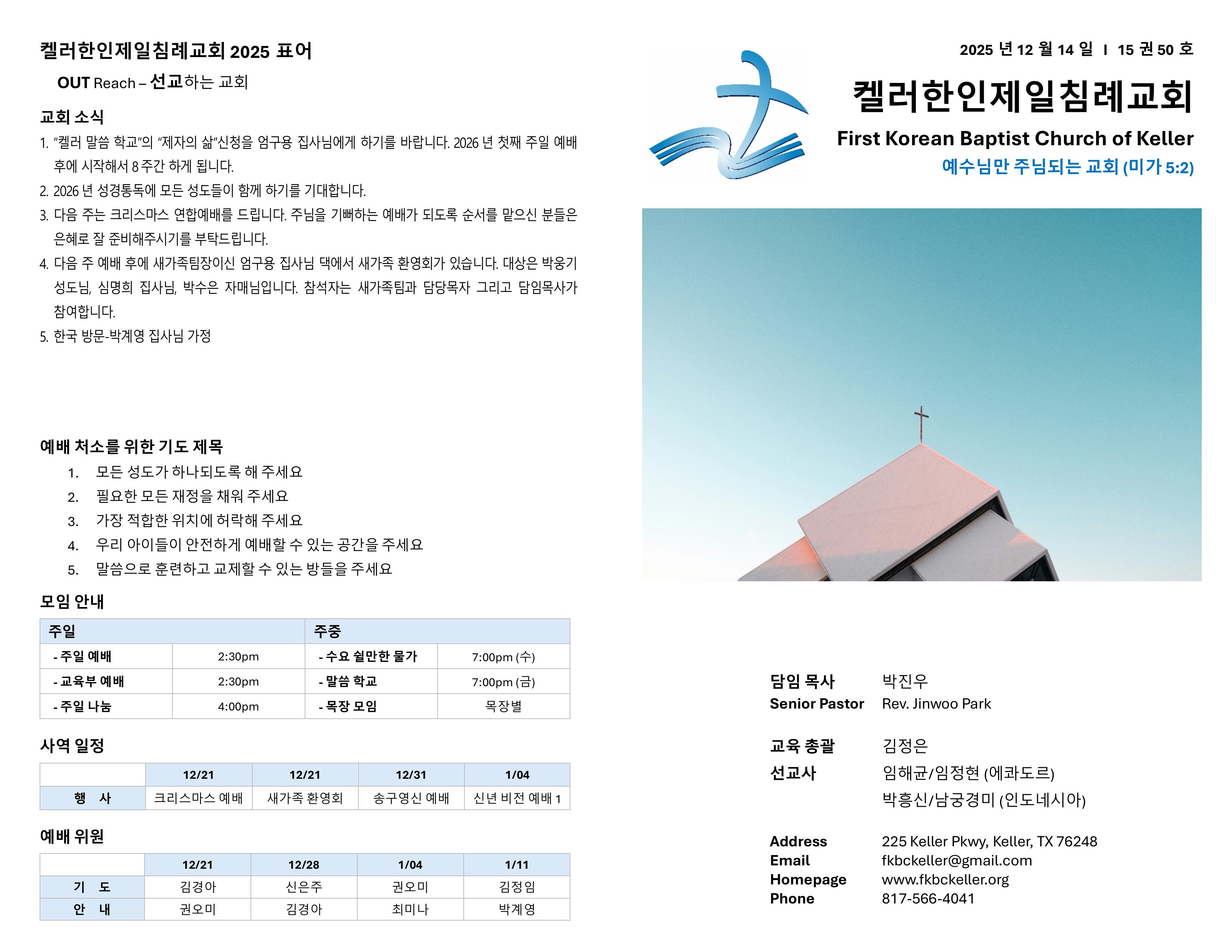 주보 주보/설교노트 - 12/14/2025 페이지 정보 작성자 FKBCK 댓글 0건 조회 79회 작성일 25-12-12 17:19 목록 본문 주일 예배 주보 다음글주보/설교노트 - 12/07/2025 25.12.06 목록 댓글 0 댓글목록 등록된 댓글이 없습니다.