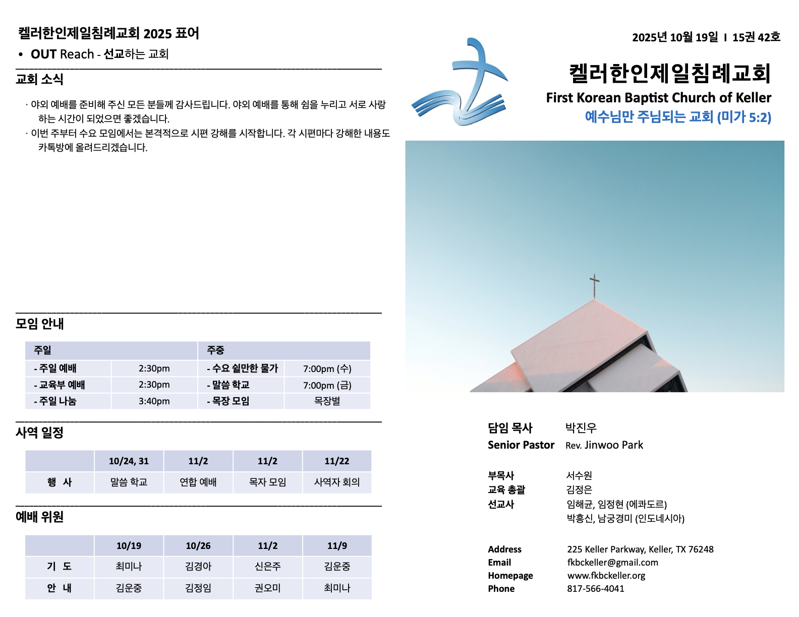 주보 · 총 101개의 게시글이 있습니다. 95 FKBCK | Oct 19, 2025 주보/설교노트 - 10/19/2025 자세히 보기 94 FKBCK | Oct 12, 2025 주보/설교노트 - 10/12/2025 자세히 보기 93 FKBCK | Oct 05, 2025 주보/설교노트 - 10/05/2025 자세히 보기 92 FKBCK | Sep 28, 2025 주보/설교노트 - 09/28/2025 자세히 보기 91 FKBCK | Sep 21, 2025 주보/설교노트 - 09/21/2025 자세히 보기 90 FKBCK | Sep 14, 2025 주보/설교노트 - 09/14/2025 자세히 보기 처음 1페이지 열린2페이지 3페이지 4페이지 5페이지 6페이지 7페이지 8페이지 9페이지 10페이지 다음 맨끝 검색 검색대상 제목내용제목+내용글쓴이글쓴이(코) 검색어 필수 검색 닫기